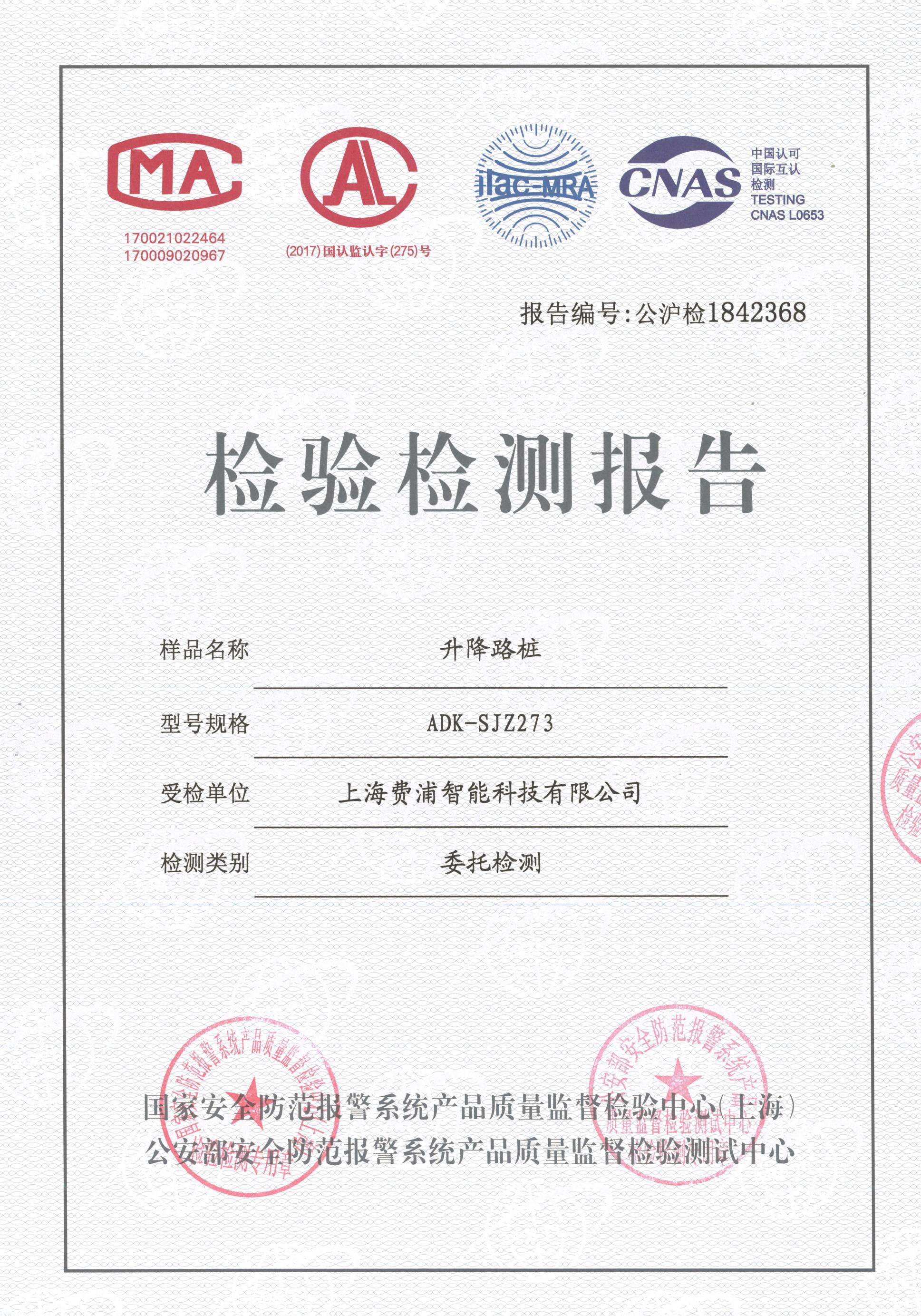 日前,隸屬于公安部第三研究所的國家安全防范報(bào)警系統(tǒng)產(chǎn)品質(zhì)量檢測監(jiān)督中心(上海)、公安部安全防范報(bào)警系統(tǒng)產(chǎn)品質(zhì)量監(jiān)督檢驗(yàn)測試中心公布了對全自動液壓升降路樁(ADK-SJZ273)的檢驗(yàn)結(jié)果,三所從產(chǎn)品外觀、產(chǎn)品質(zhì)量、環(huán)境適應(yīng)性、防護(hù)要求、緊急功能等11個檢測項(xiàng)目入手,檢驗(yàn)受測產(chǎn)品的性能是否符合技術(shù)要求,以確保受檢測產(chǎn)品在交付應(yīng)用中的專業(yè)性、可靠性、安全性。經(jīng)嚴(yán)格的技術(shù)審核及檢測,全部符合國家標(biāo)準(zhǔn)及上海市地方安防標(biāo)準(zhǔn),有多項(xiàng)指標(biāo)高于國家標(biāo)準(zhǔn)及地方標(biāo)準(zhǔn),獲得了公安三所頒發(fā)的《檢驗(yàn)檢測報(bào)告》。